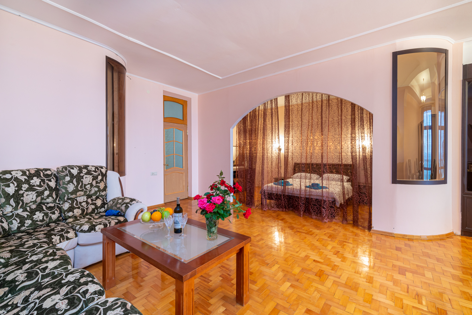 2 осн. места. 2 доп. места. Мебель: гардеробная, диван раскладной, зеркало, кресла, кровать двуспальная, прикроватные тумбочки, пуфик, стол, шкаф.