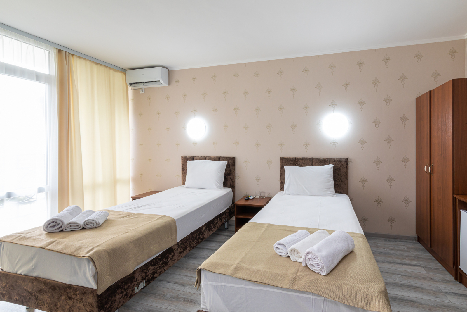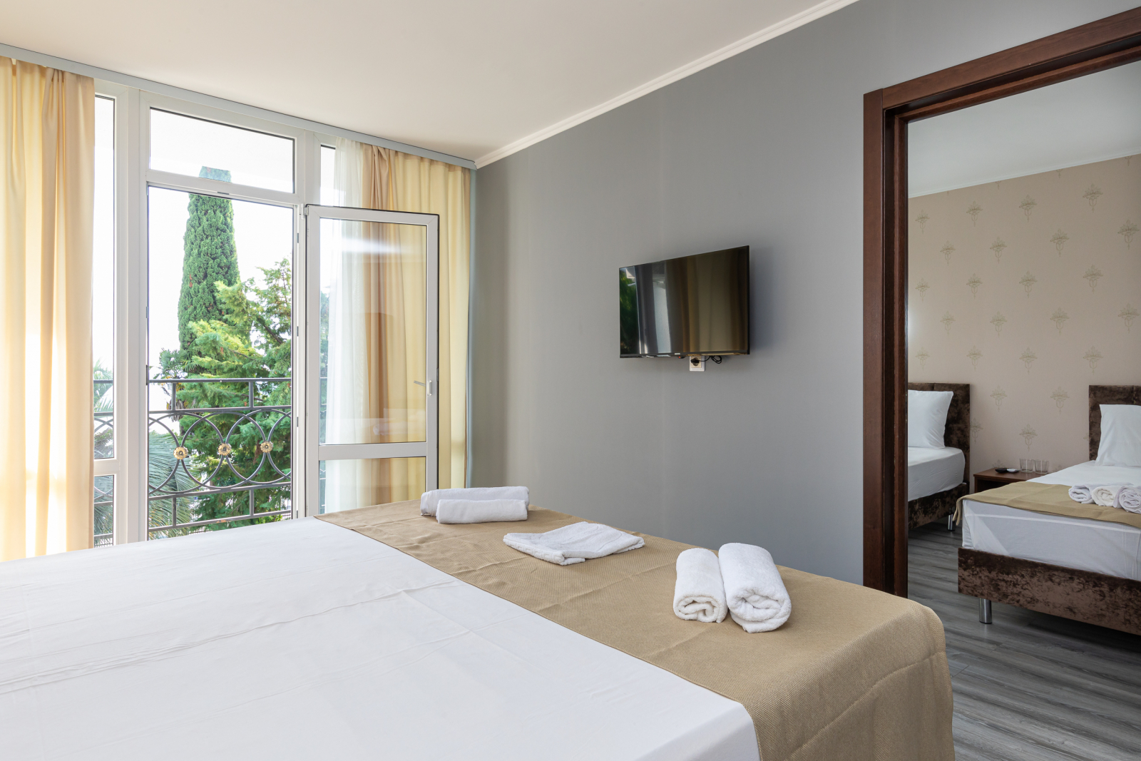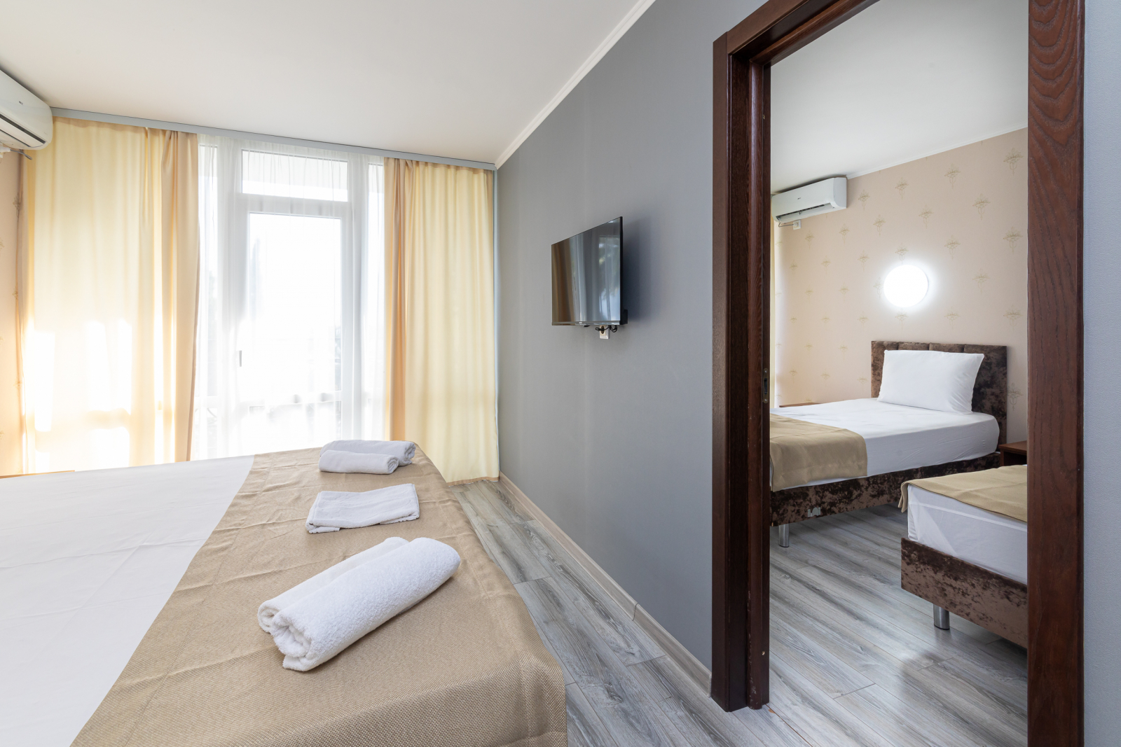 Площадь номера - 35 кв.м. 4 осн. места. 2 доп. места. Коннект-номер. Мебель: вешалка, зеркало, кровати односпальные (2), кровать двуспальная, прикроватные тумбочки, стол, стулья, шкаф. Оборудование: кондиционер, телевизор, холодильник. Санузел: с душем, туалетные принадлежности. Сервис: Wi-Fi бесплатно, смена полотенец, смена постельного белья, уборка номера.