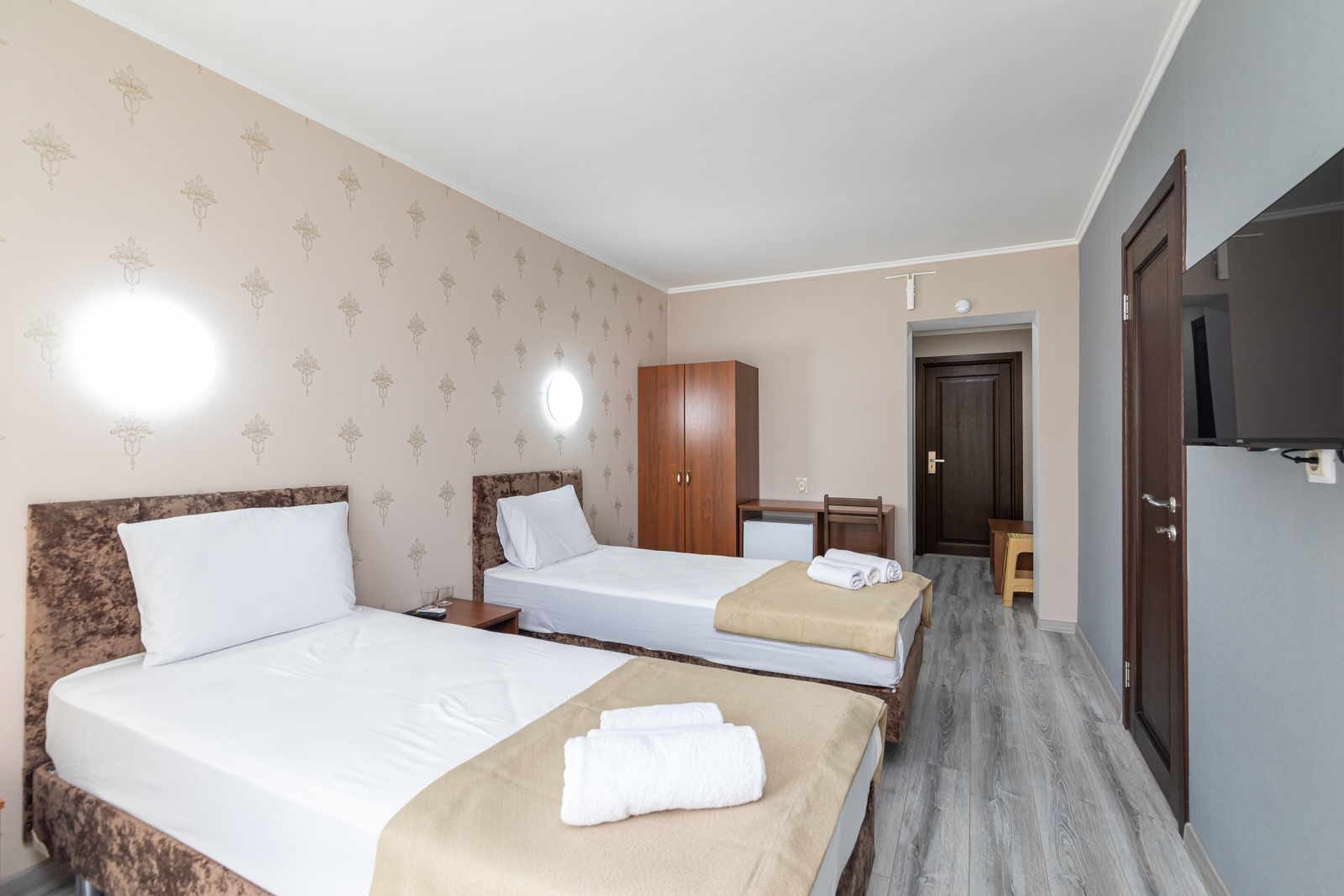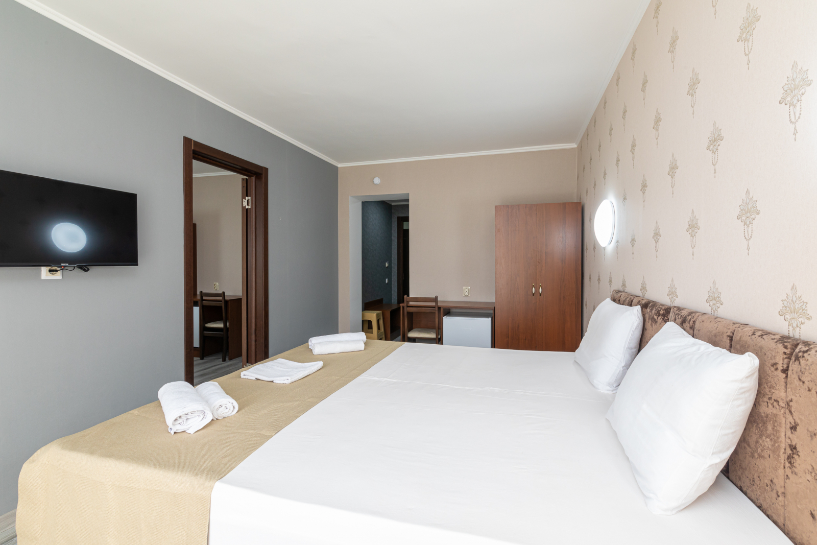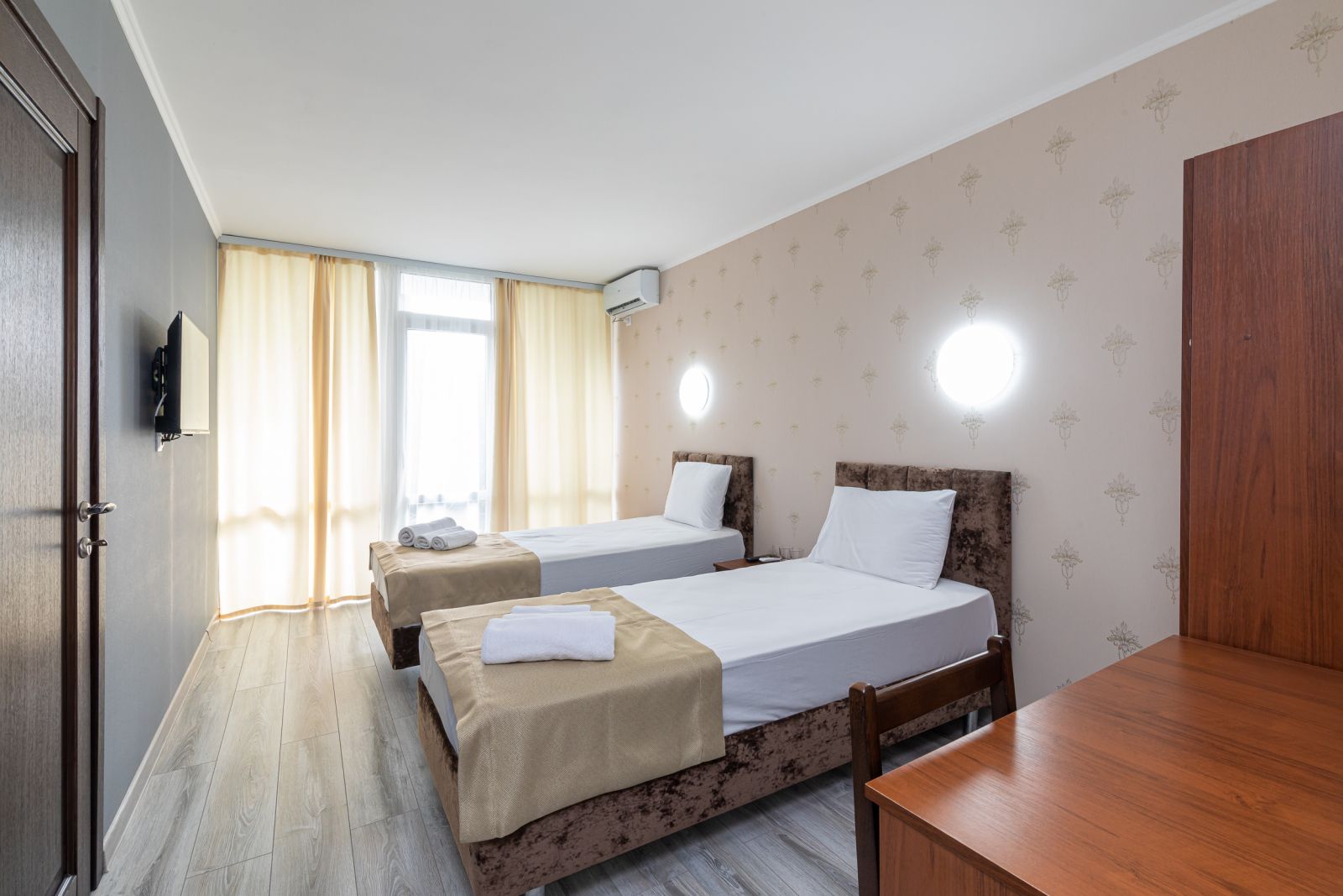 Площадь номера - 35 кв.м. 4 осн. места. 2 доп. места. Коннект-номер. Мебель: вешалка, зеркало, кровати односпальные (2), кровать двуспальная, прикроватные тумбочки, стол, стулья, шкаф. Оборудование: кондиционер, телевизор, холодильник. Санузел: с душем, туалетные принадлежности. Сервис: Wi-Fi бесплатно, смена полотенец, смена постельного белья, уборка номера.