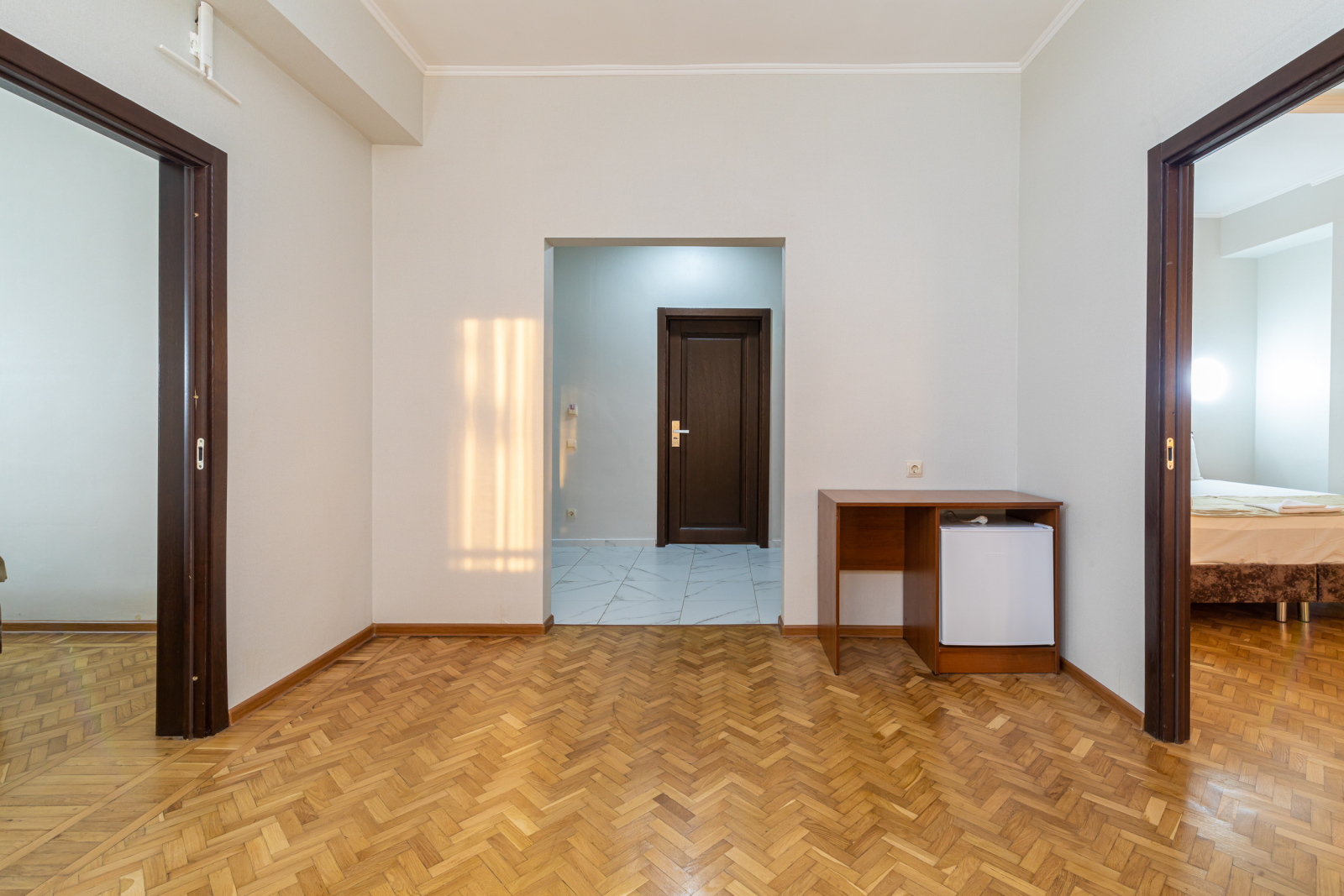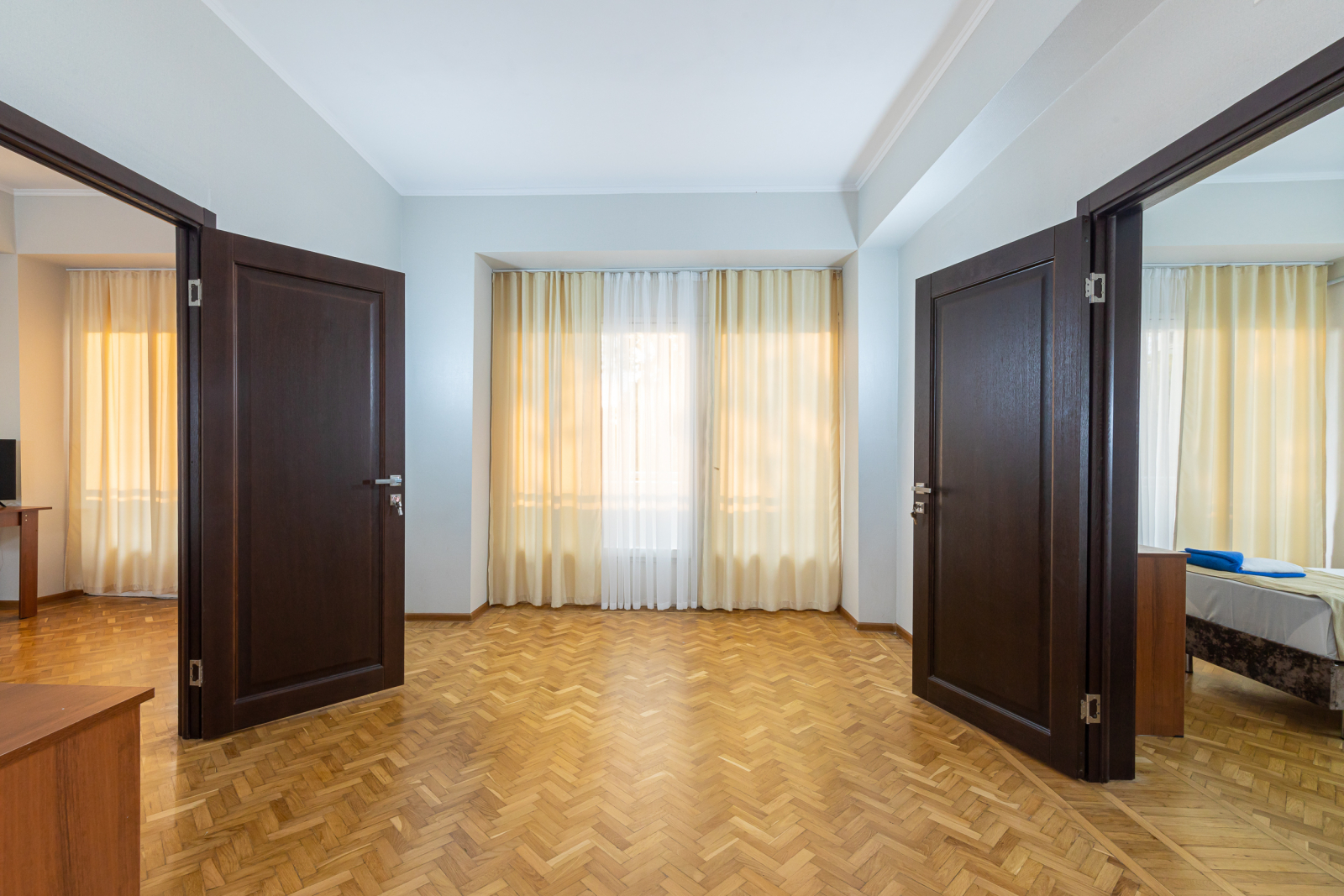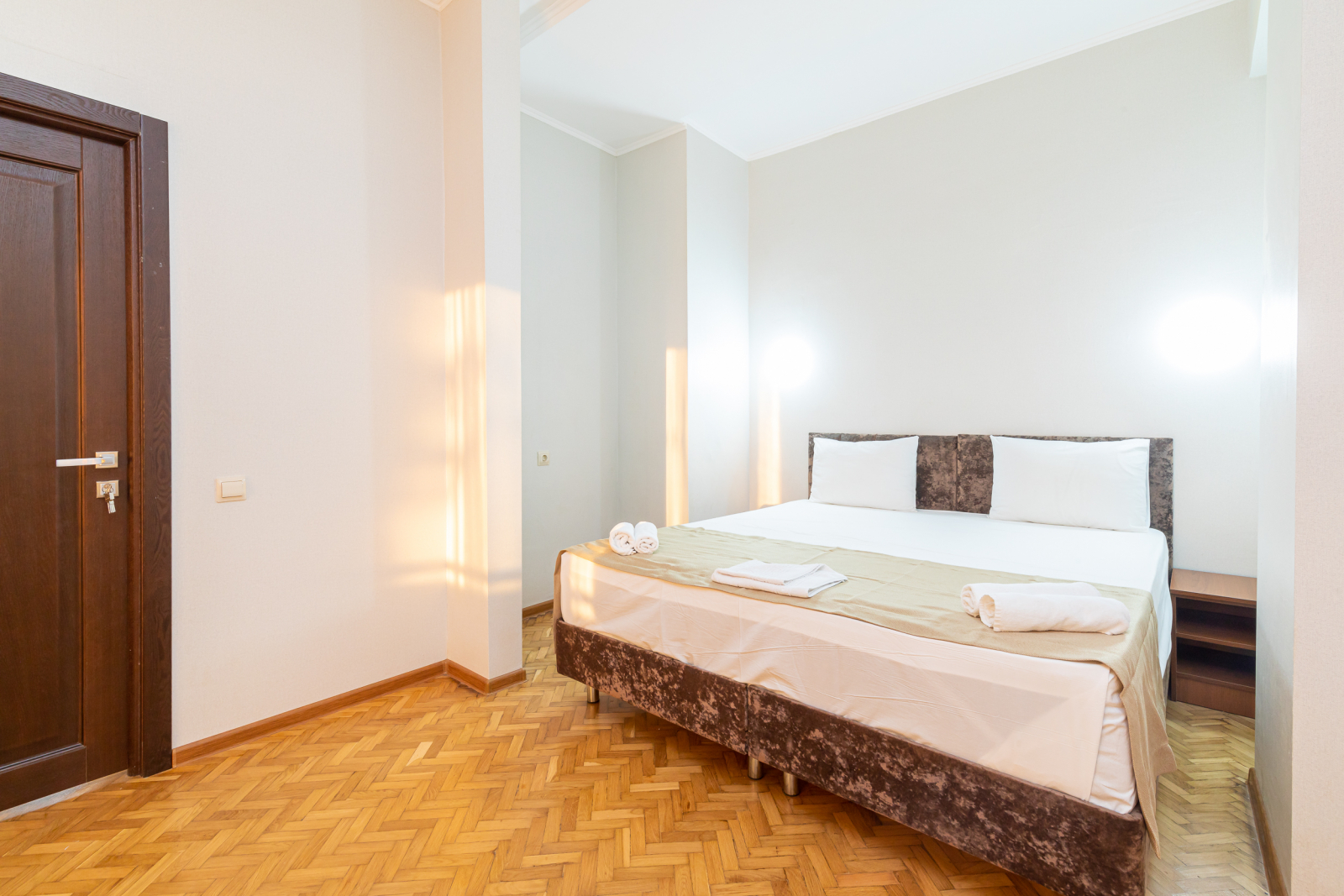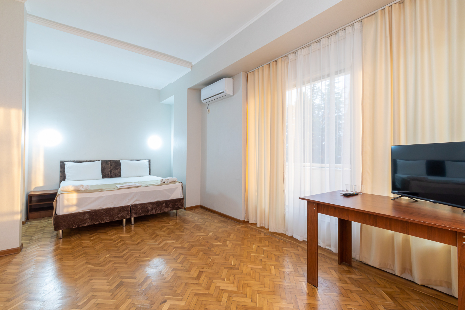 Площадь номера - 36 кв.м. 4 осн. места. 2 доп. места. Балкон. Мебель: вешалка, зеркало, кровати односпальные (2), кровать двуспальная, прикроватные тумбочки, стол, стулья, тумба, шкаф. Оборудование: кондиционер, телевизор, холодильник. Санузел: с душем, туалетные принадлежности, фен. Сервис: Wi-Fi бесплатно, смена полотенец, смена постельного белья, уборка номера.