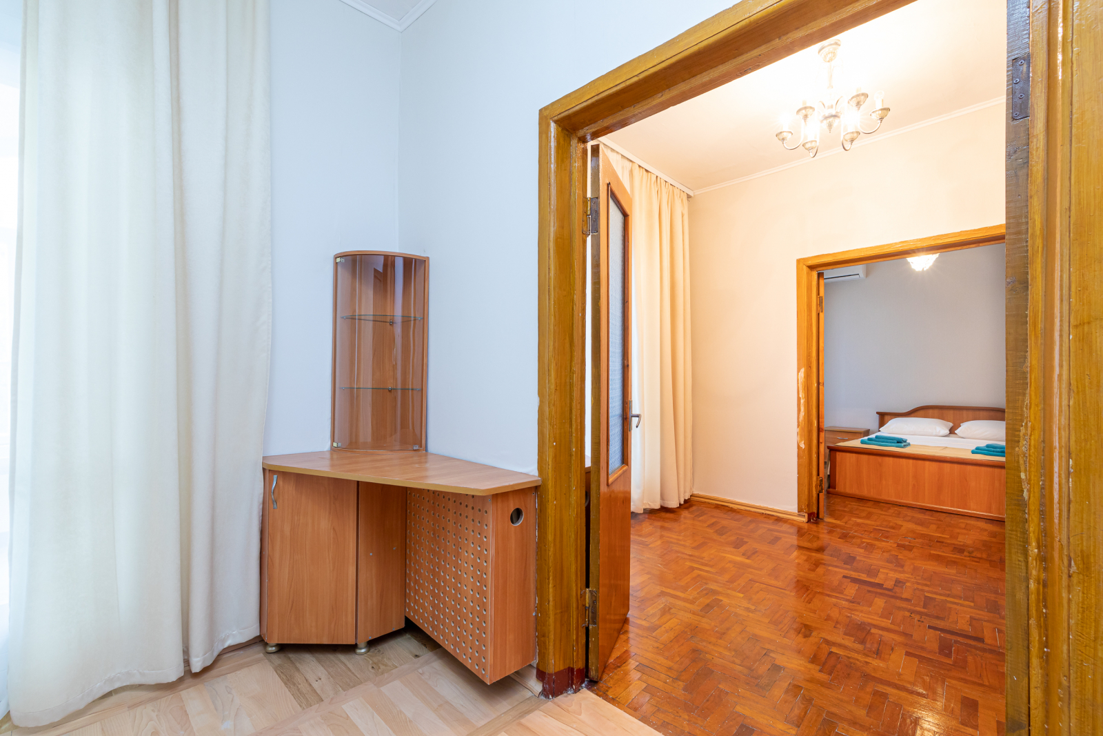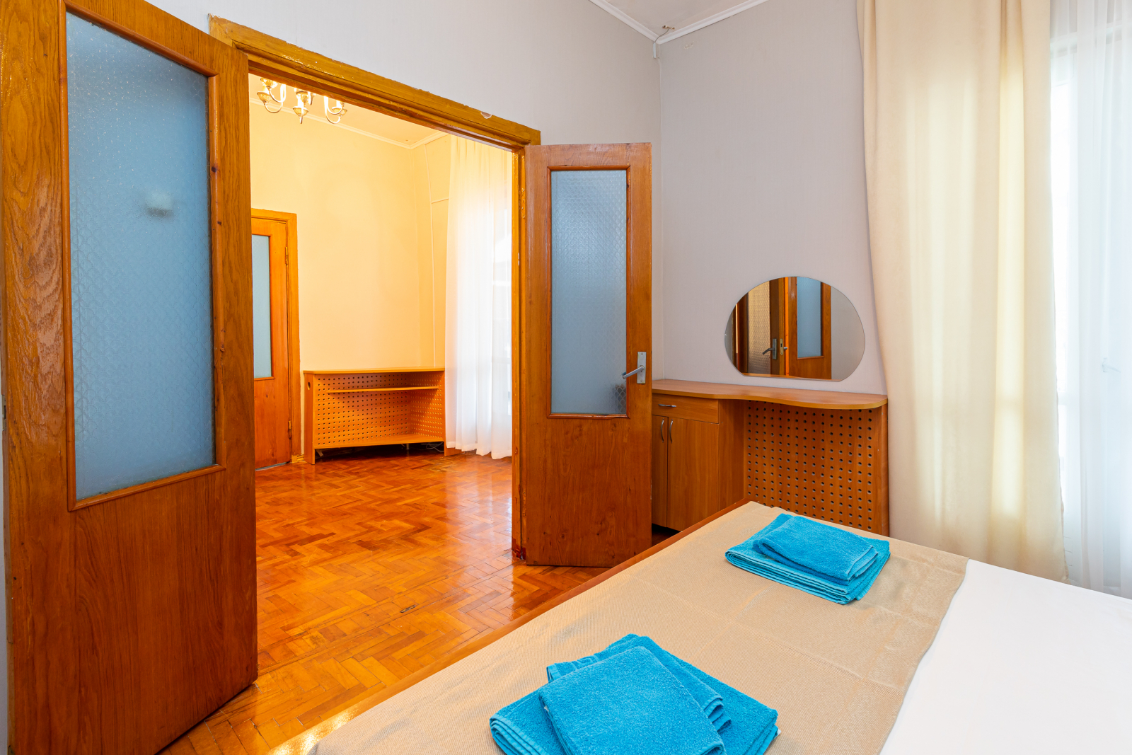 4 осн. места. 1 доп. место. Балкон. Мебель: вешалка, диван раскладной, зеркало, кровать двуспальная, прикроватные тумбочки, стол, тумба, шкаф. Оборудование: кондиционер, телевизор, холодильник. Санузел: с душем, туалетные принадлежности. Сервис: Wi-Fi бесплатно, смена полотенец, смена постельного белья, уборка номера.