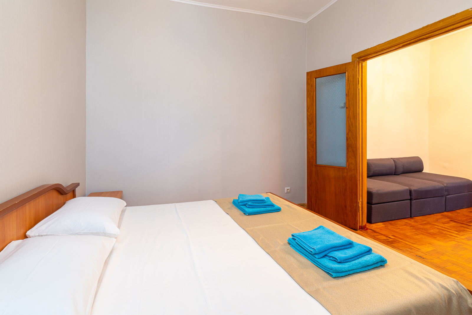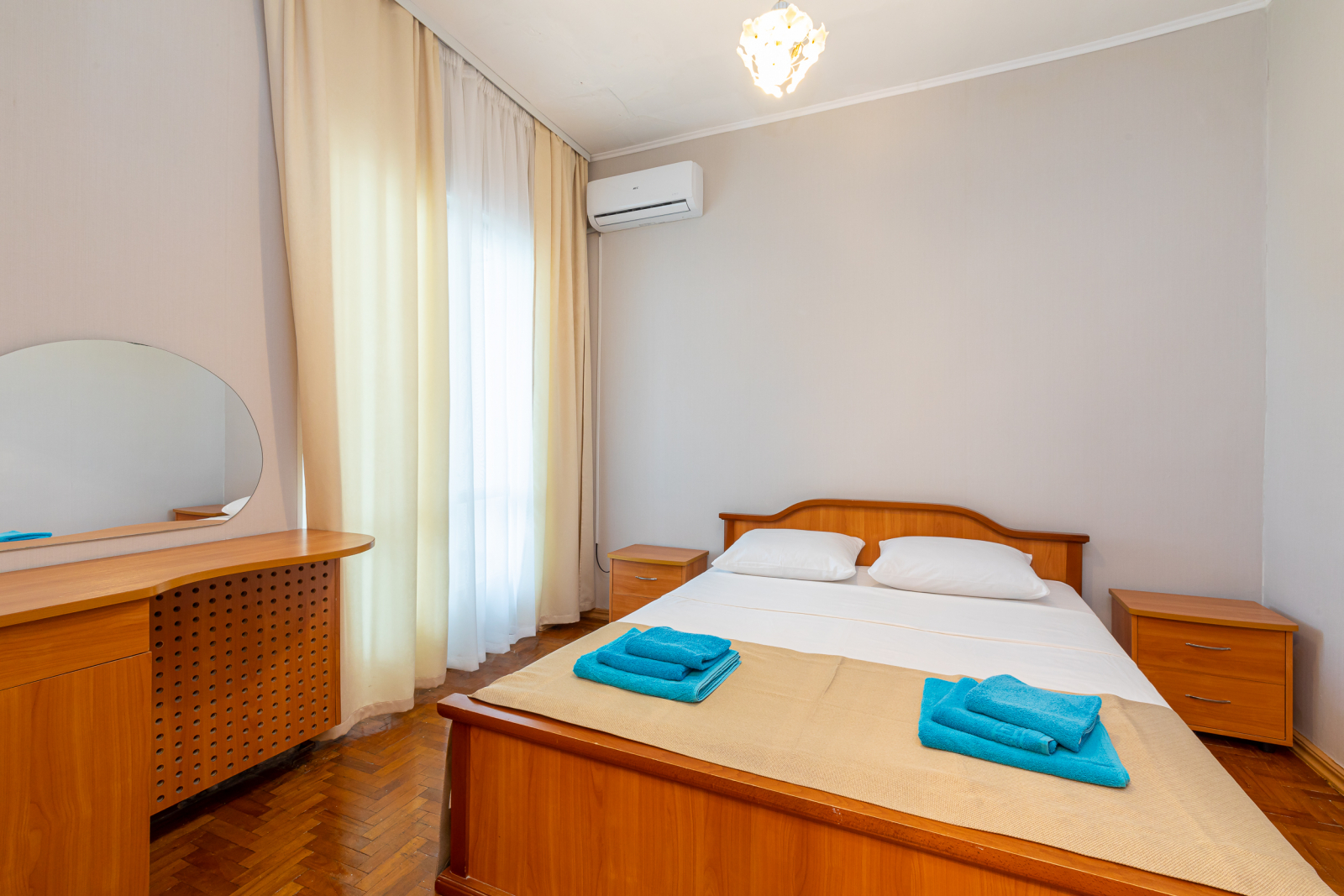 4 осн. места. 1 доп. место. Мебель: вешалка, диван раскладной, зеркало, кровать двуспальная, прикроватные тумбочки, стол, тумба, шкаф. Оборудование: кондиционер, телевизор, холодильник. Санузел: с душем, туалетные принадлежности. Сервис: Wi-Fi бесплатно, смена полотенец, смена постельного белья, уборка номера.