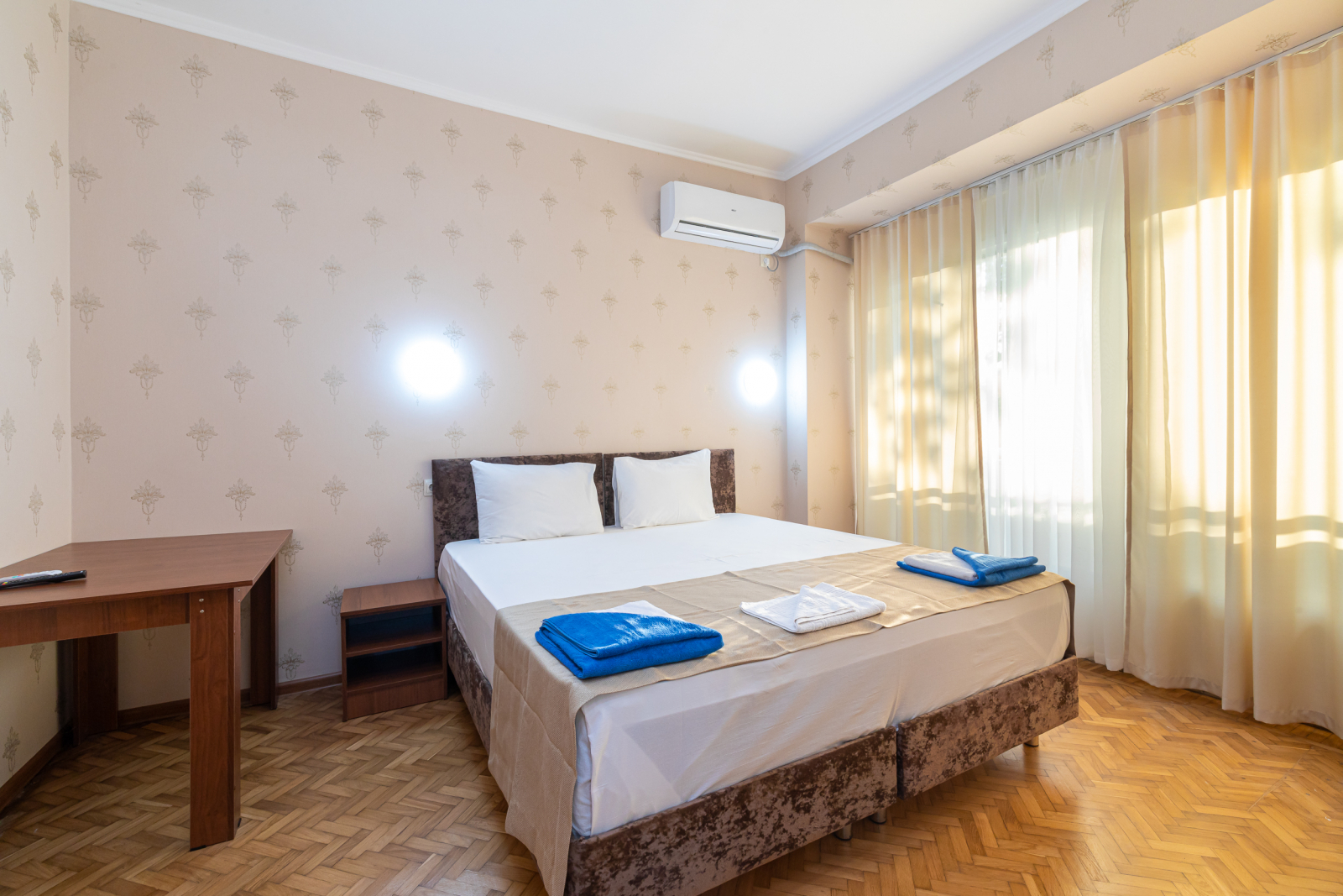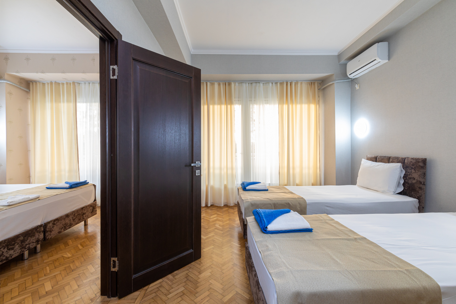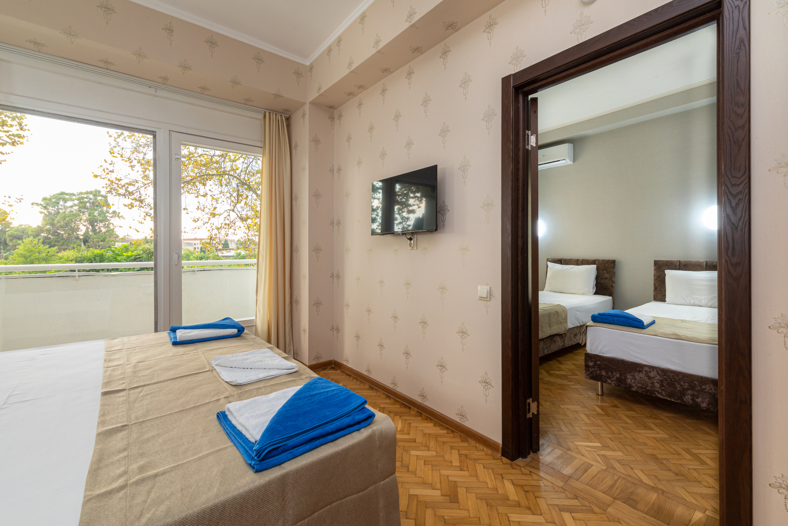 Площадь номера - 32 кв.м. 4 осн. места. 2 доп. места. Балкон. Мебель: вешалка, зеркало, кровати односпальные (2), кровать двуспальная, прикроватные тумбочки, стол, шкаф. Оборудование: кондиционер, телевизор, холодильник. Санузел: с душем, туалетные принадлежности. Сервис: Wi-Fi бесплатно, смена полотенец, смена постельного белья, уборка номера.