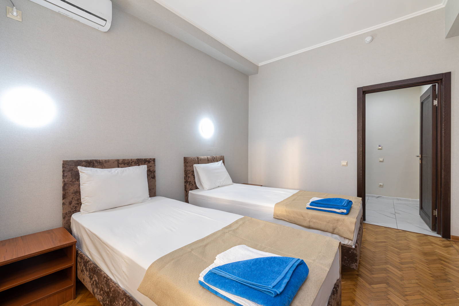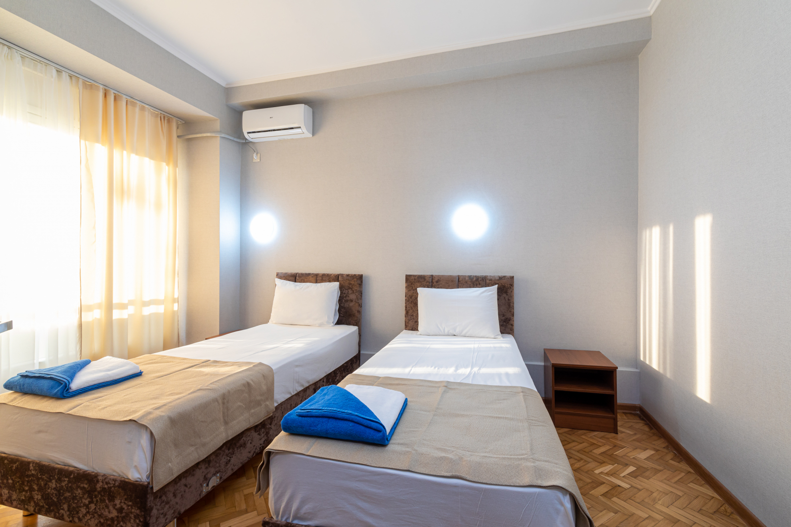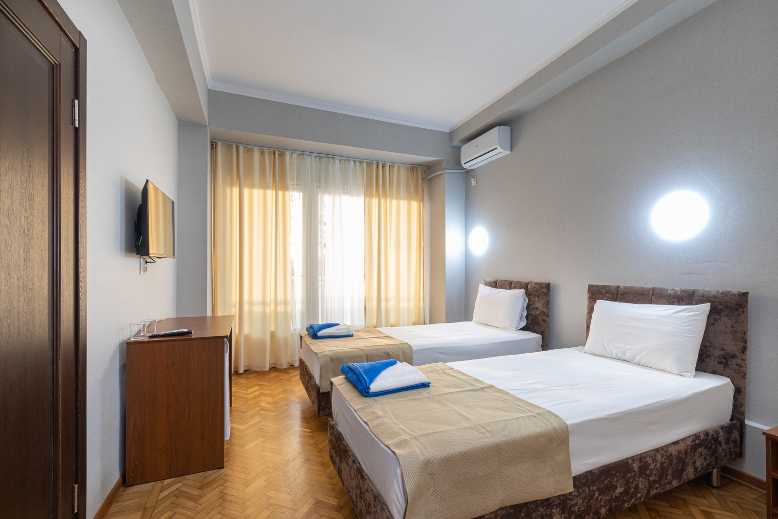 Площадь номера - 32 кв.м. 4 осн. места. 2 доп. места. Балкон. Мебель: вешалка, зеркало, кровати односпальные (2), кровать двуспальная, прикроватные тумбочки, стол, шкаф. Оборудование: кондиционер, телевизор, холодильник. Санузел: с душем, туалетные принадлежности. Сервис: Wi-Fi бесплатно, смена полотенец, смена постельного белья, уборка номера.