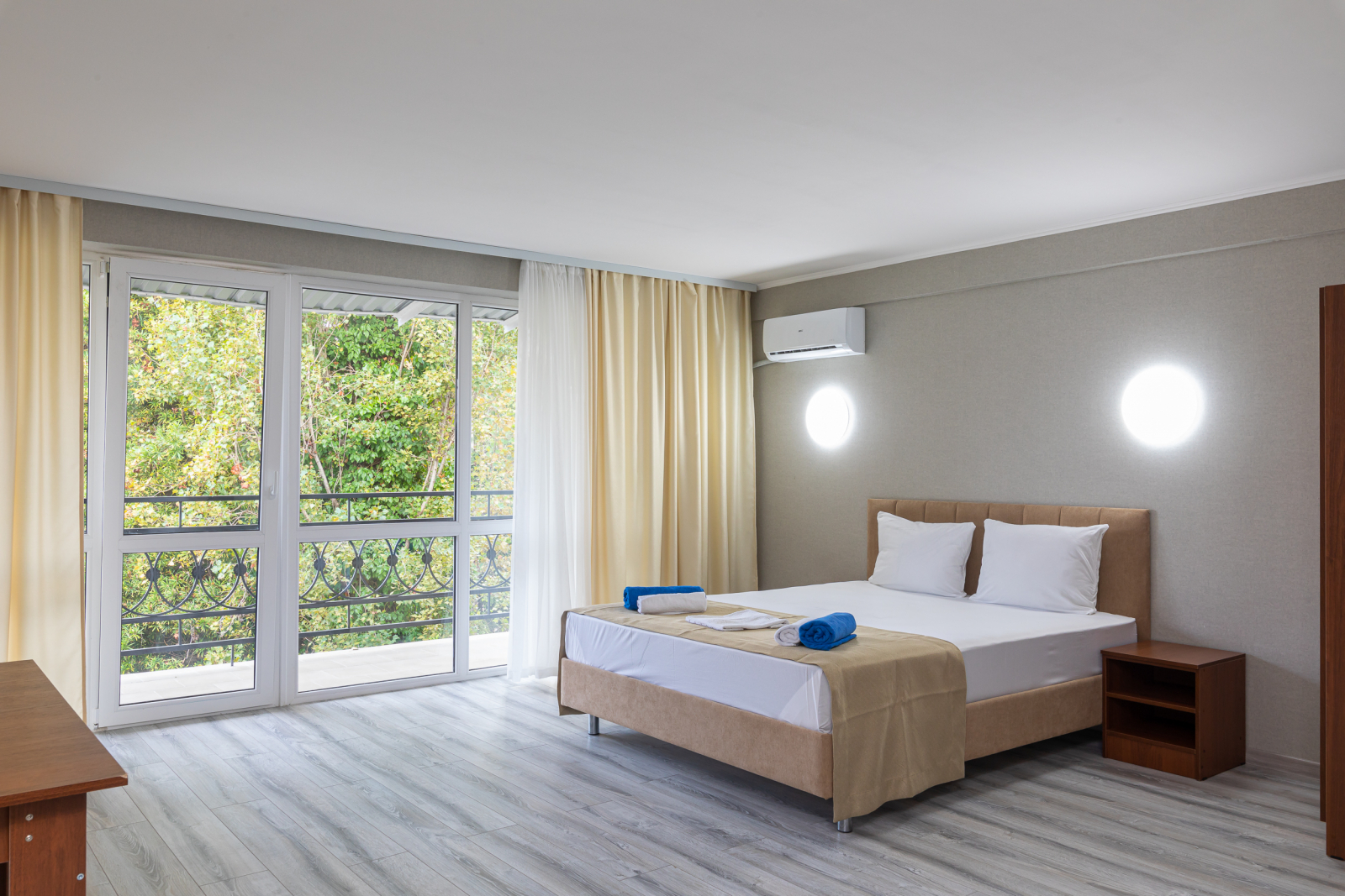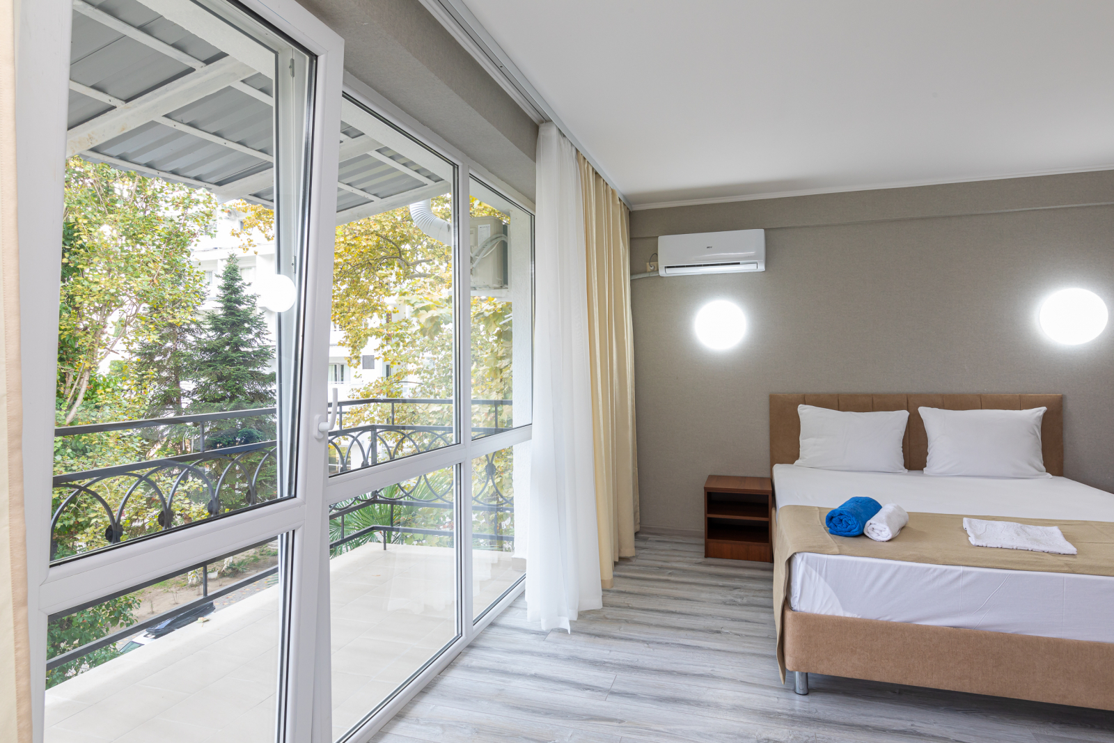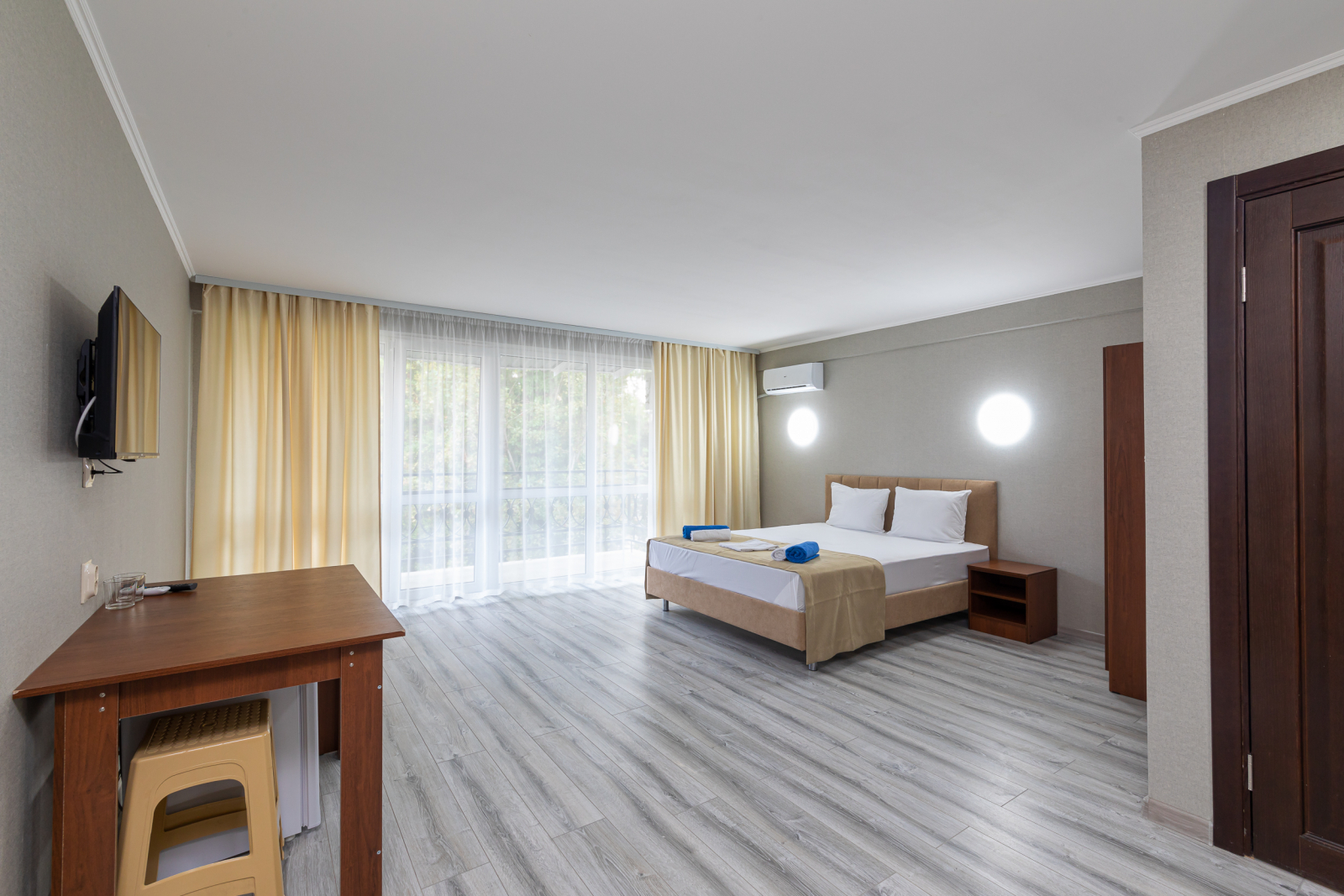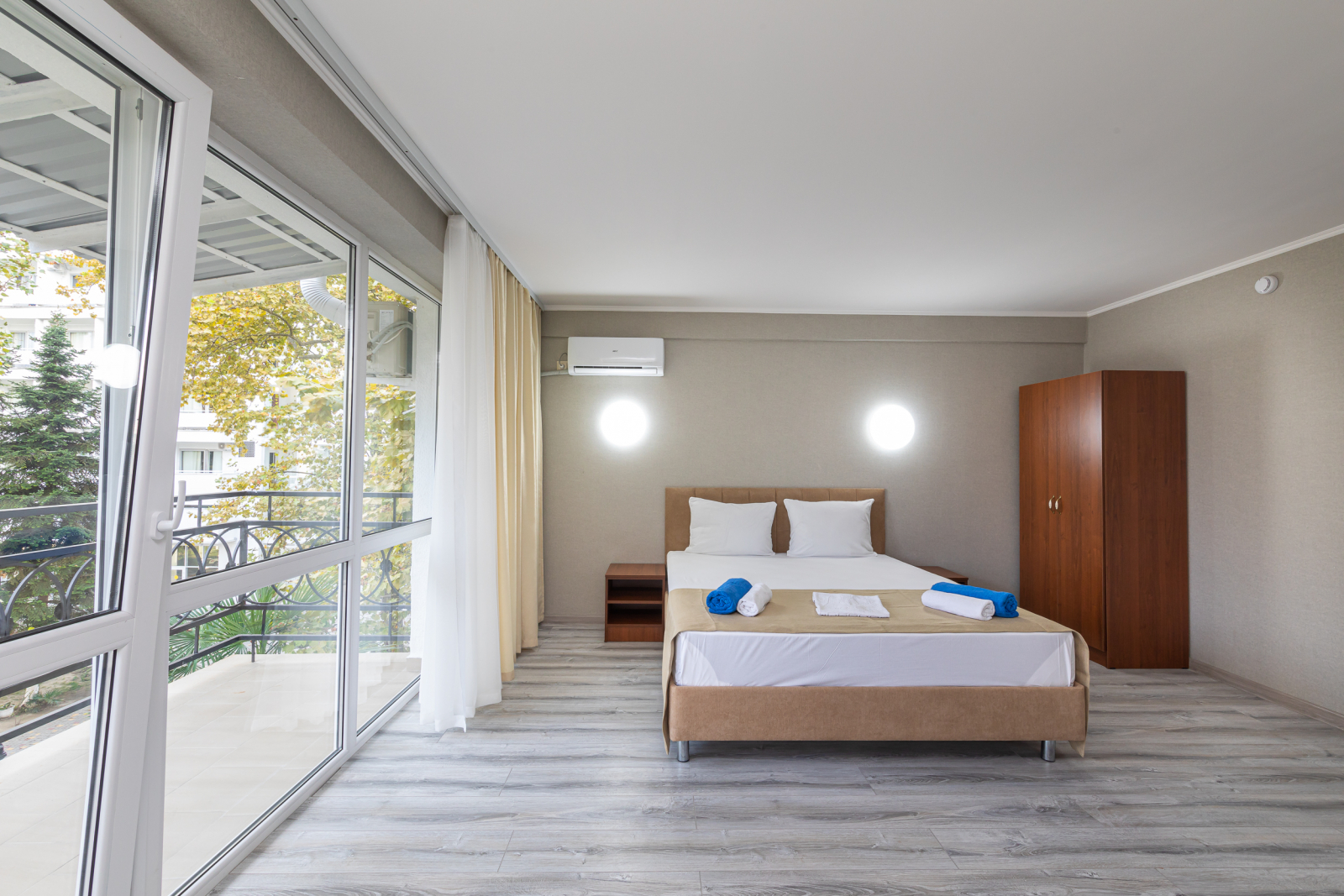 Площадь номера - 16-20 кв.м. 2 осн. места. 1 доп. место. Балкон. Мебель: вешалка, зеркало, кровати односпальные /одна двуспальная кровать, прикроватные тумбочки, стол, стулья, тумба, шкаф. Оборудование: кондиционер, телевизор, холодильник. Санузел: с душем, туалетные принадлежности, фен. Сервис: Wi-Fi бесплатно, смена полотенец, смена постельного белья, уборка номера.