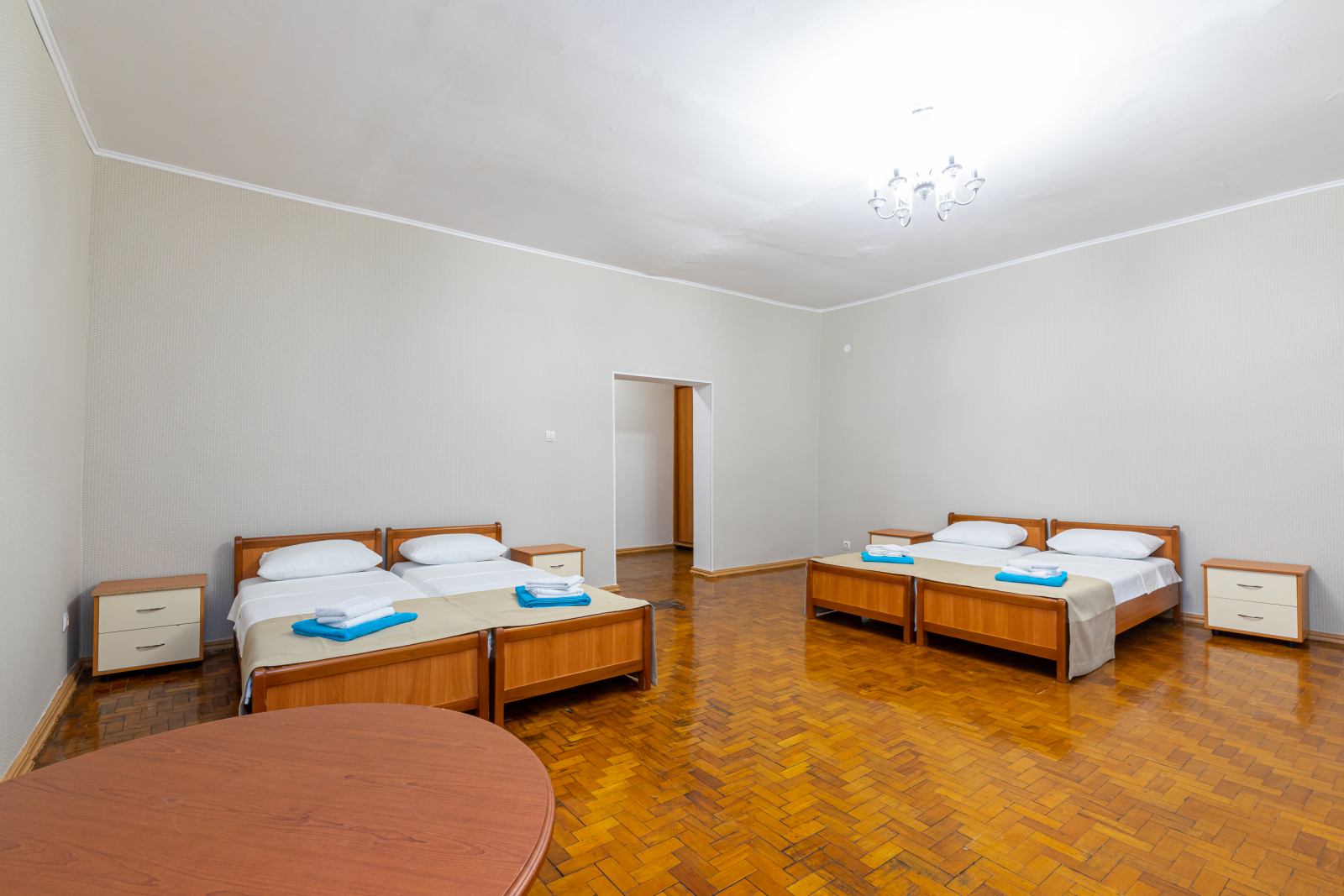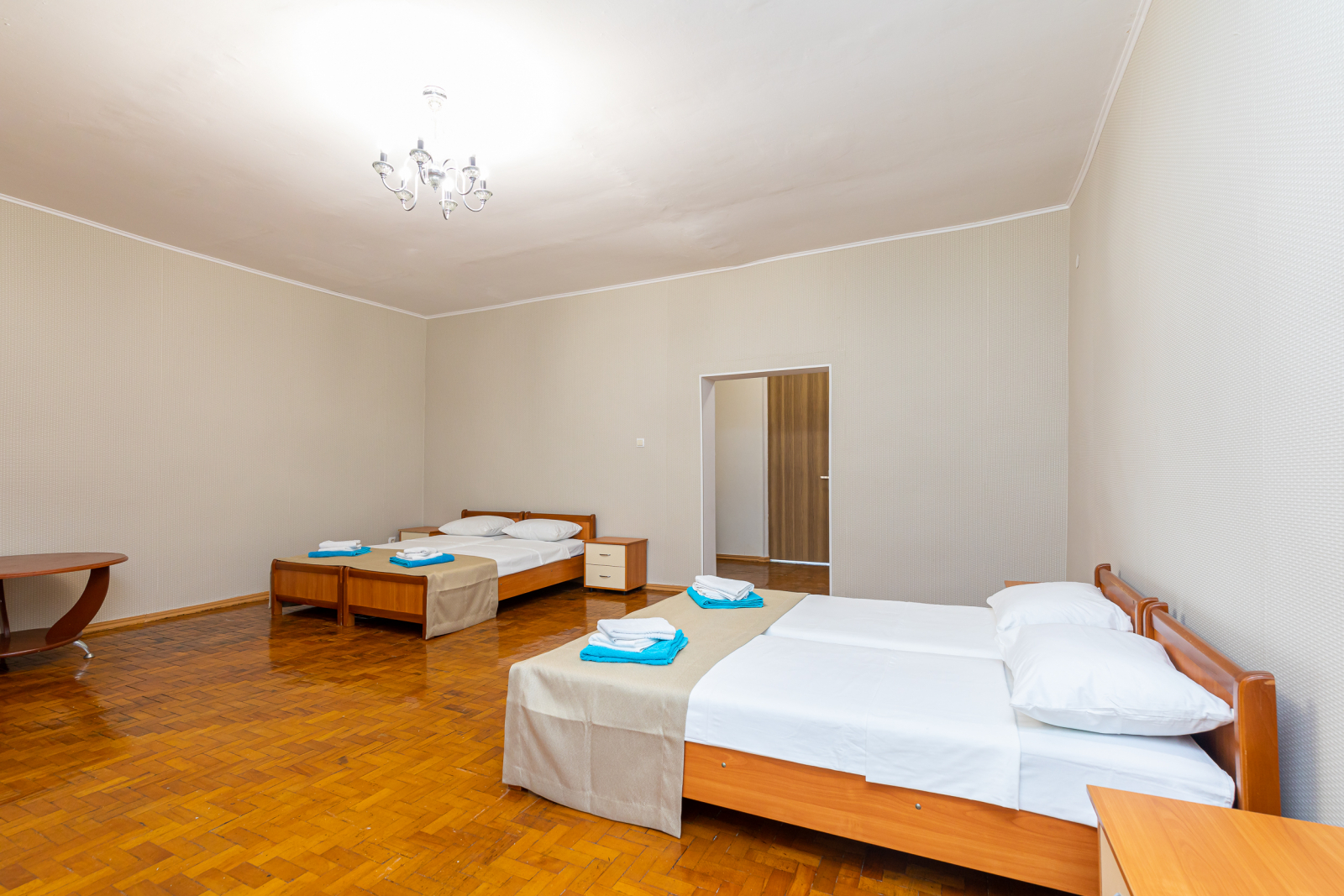 4 осн. места. 1 доп. место. Балкон. Мебель: вешалка, зеркало, кровати односпальные (2), кровать двуспальная, прикроватные тумбочки, стол, тумба, шкаф.
